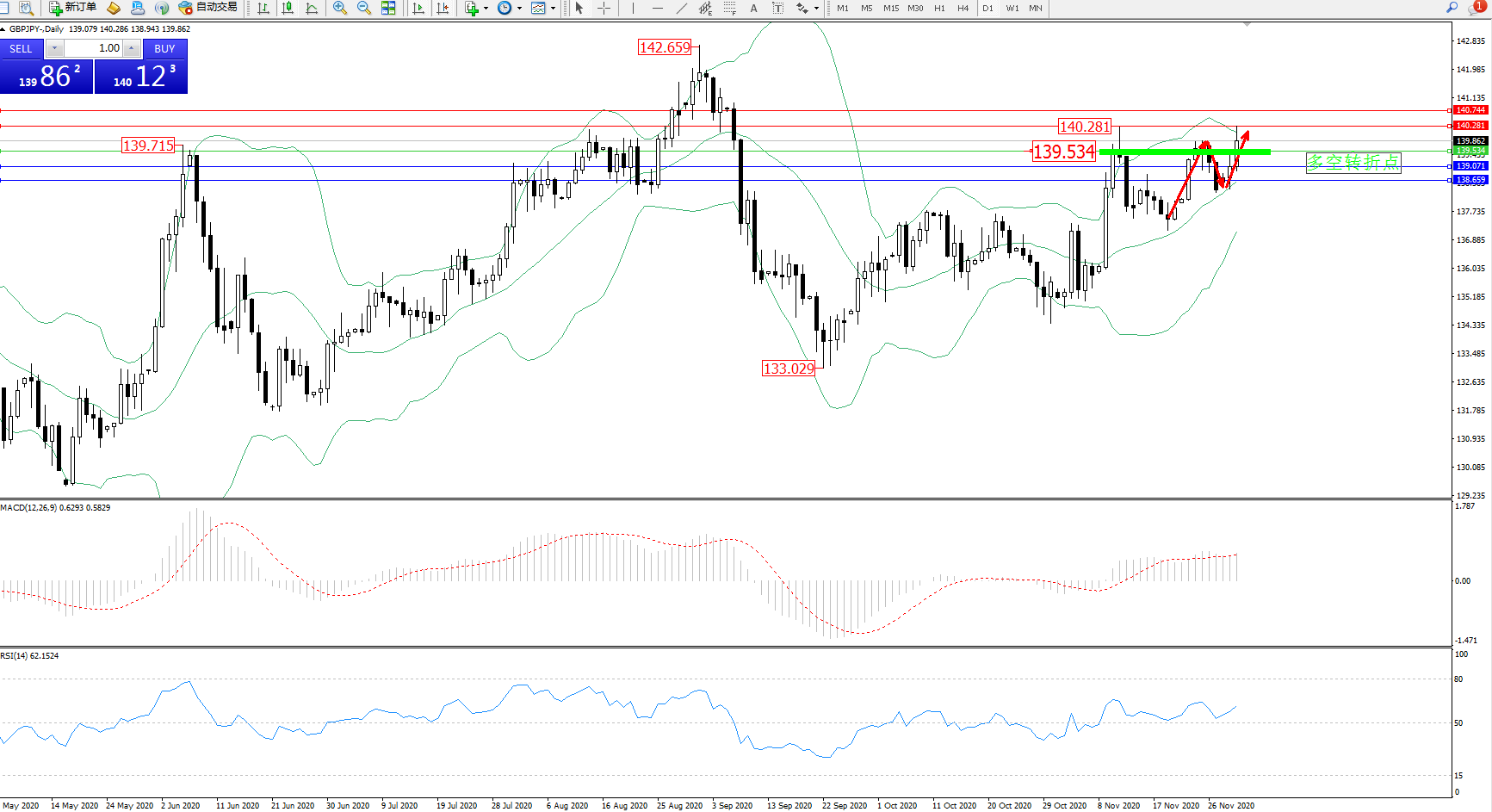 技术点评:多头动力延续布林带指标中上轨区间持续宽幅震荡向上移动态势良好,期间多头动力试探上轨附近节点,前期高位140.281位置已再度触及,且有破位上扬迹象,布林带指标呈收口走势中,MACD指标处于多头区域持续整理平移中,RSI指标处于50均衡线上方维持整理走势向上移动中;