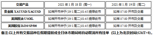 因应美国马丁路德金纪念日假期 (2021118日周一) 以下产品的交易时间将于假期期间提早休市,敬请阁下留意知悉!