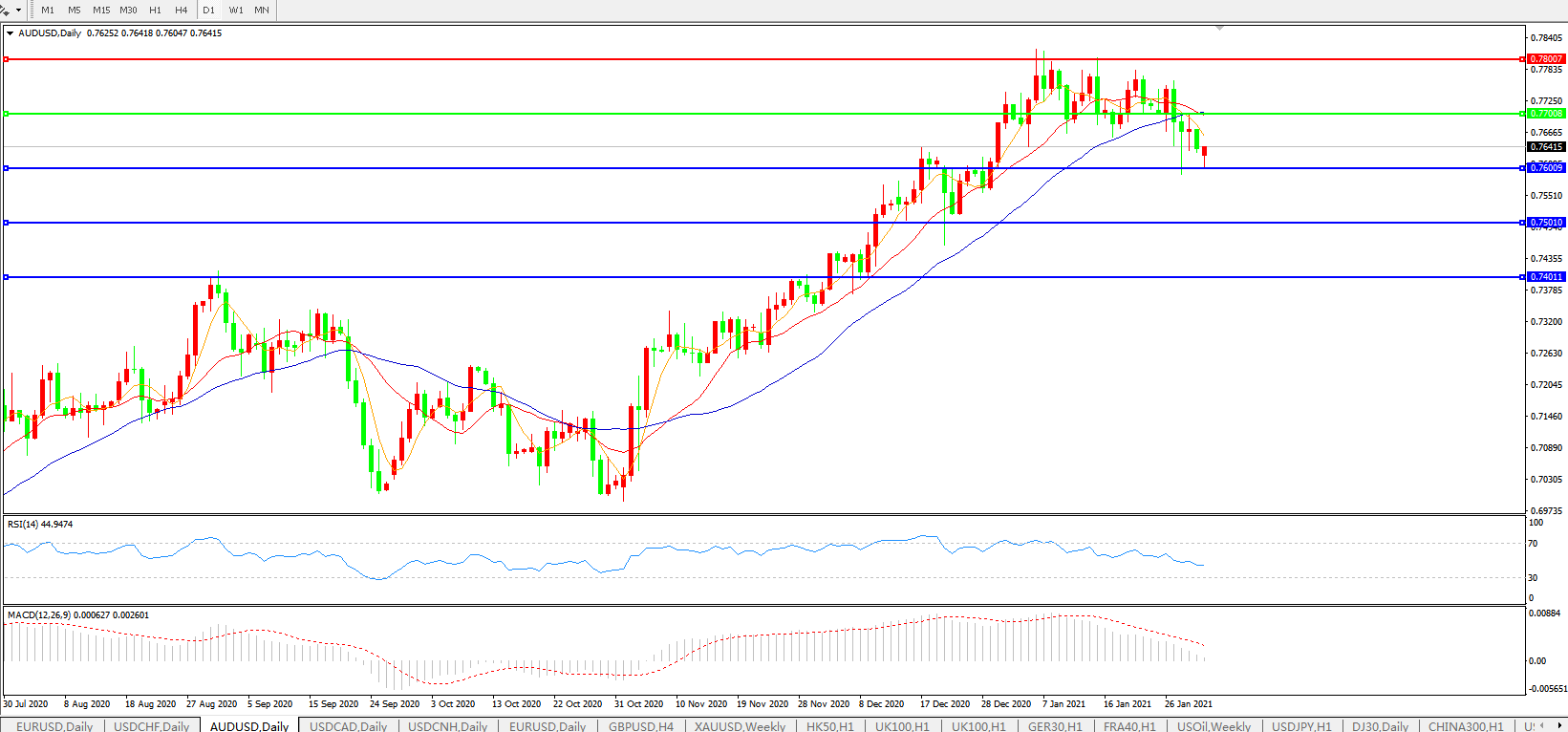 澳元兑美元在周一亚市开盘之际再度承压走低,一度触及0.7606的低位,令0.76关口再度面临冲击,而之后澳洲方面发布的经济数据喜忧参半,对汇价进一步影响有限。投资者在周二澳洲联储年内首次决议来袭之前正维持着相对谨慎的情绪; 由于上周以来美国股市出现回调,拖累全球股指回落,这也令金融市场风险偏好情绪恶化,令面对风险情绪敏感的澳元汇价遭遇首当其冲的打击。而于此同时,全球疫情前景的进一步不确定性,也令市场缺少继续做多商品系货币的信心; 在此状况下,自1月中旬以来,澳元日线图已经呈现出了在高位面临见顶,并缓步回落重心不断下移的态势。而周二若澳洲联储决议对当前全球市场前景给出不甚乐观的,将进一步巩固行情的头部形态,并加速汇价的回调,上周四的低位0.7592将是首要支撑,跌破后将进一步下探至0.7557