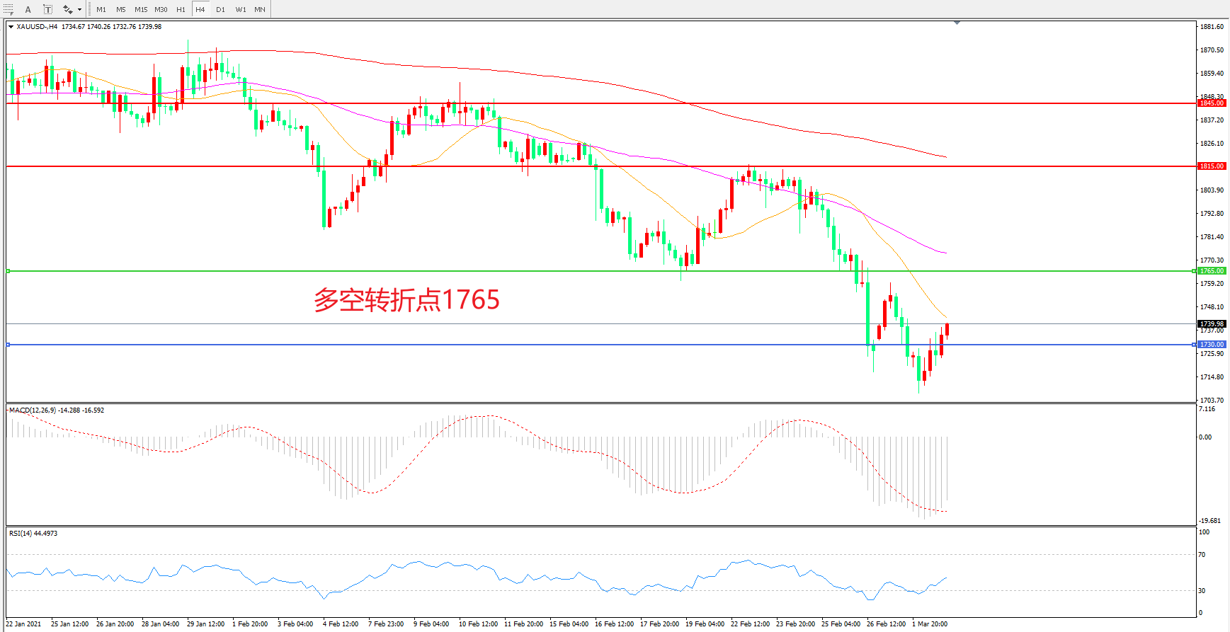 周二(3月2日),市场多空情绪交织,行情博弈进入白热化状态,一方面美元指数跌破91关口,提振了金价的反弹预期,但另一方面持续走高美债收益率如利剑悬顶,现货黄金低位宽幅震荡后收报1738.82美元/盎司。尽管目前黄金市场已经进入了超卖状态,但在空头主导的格局下,逢高做空仍是合理选择。