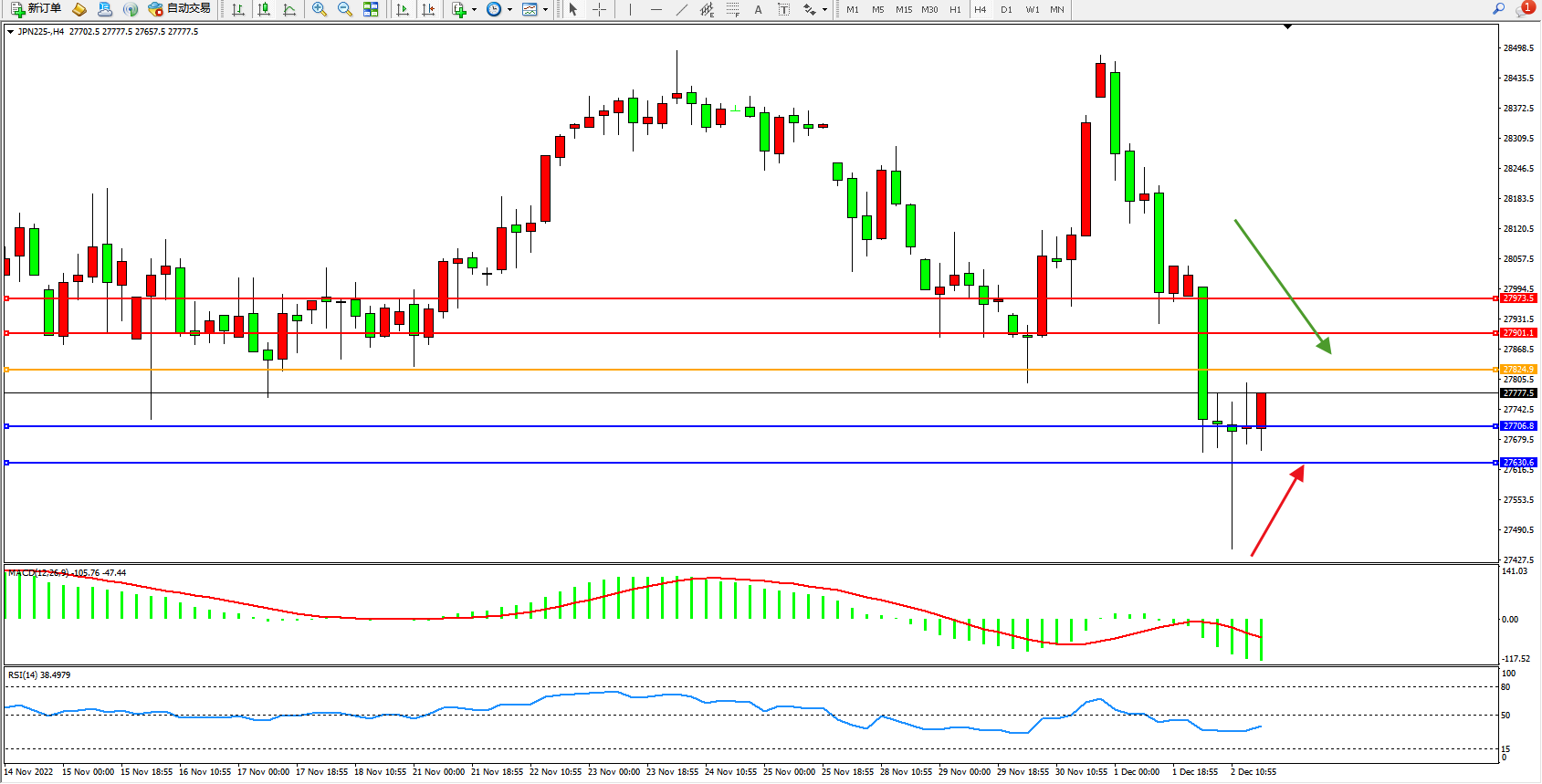 日经225指数12月2日(周五)收盘下跌461.58点,跌幅1.64%,报27764.50点。日本政府正在讨论将下一财年起5年的防卫费用提升到40万亿日元至43万亿日元水平,较目前下一财年结束的5年防卫费高1.5倍。