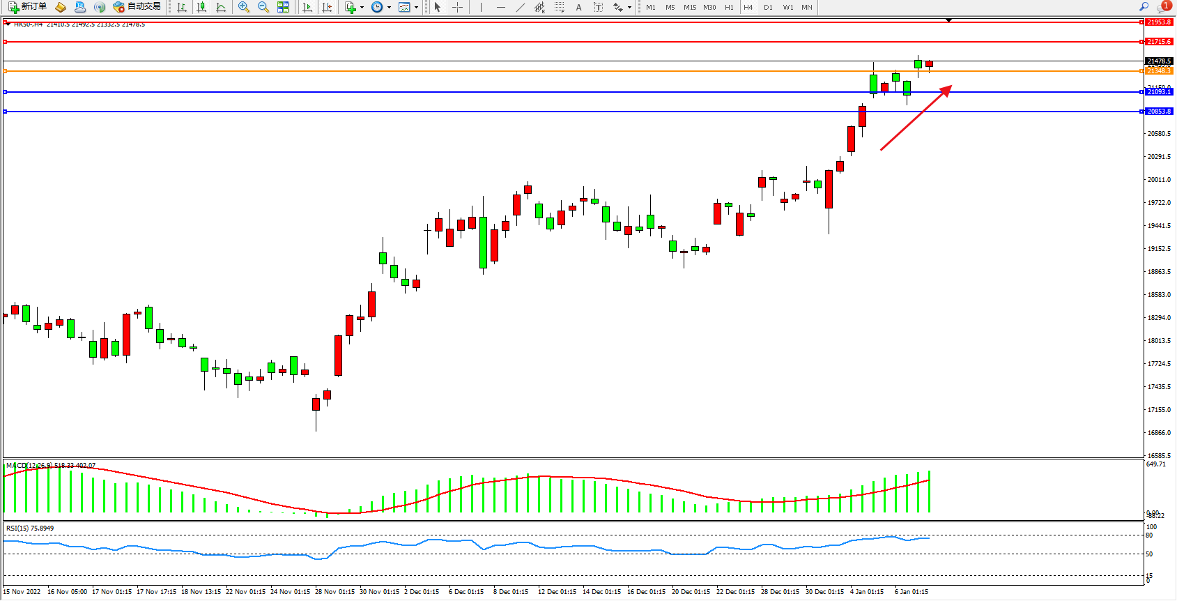 4小时图看:多头兑动力高位震荡上扬,短期看涨态势良好,市场多头不断攀升,MACD指标处于多头区域持续上移,RSI指标处于高位整理;