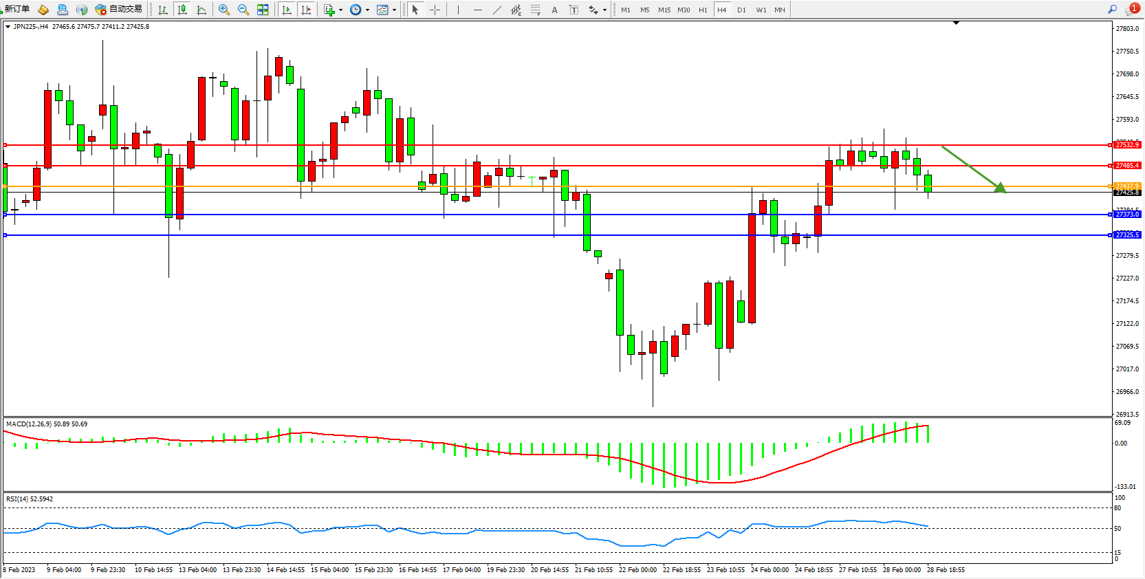 日经指数JPN225——4小时K线图显示: