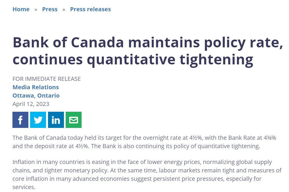 当地时间周三,加拿大央行公布了最新的利率决议,维持基准利率在4.5%不变,央行存款和贷款利率也同样维持在4.5%和4.75%不变,符合市场预期。