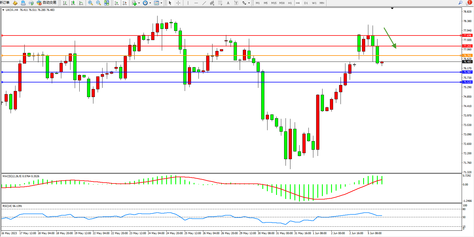 交易策略:76.761下方看跌,目标75.987 75.520
