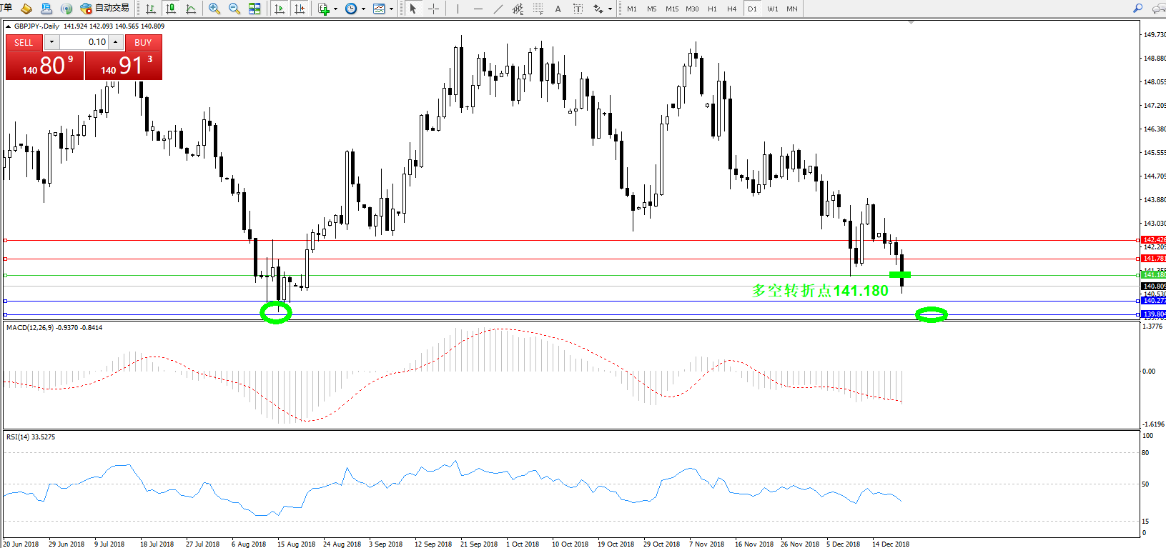 交易策略:141.180下方看跌,目标140.272、139.804
